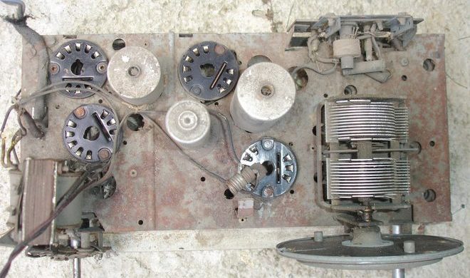 Ide o batériový superhet, s mf=468kHz. Anténa sa v rádiu môže zasunúť menej alebo viac skrátená. Vo vstupnom anténnom bloku vzadu v prijímači sú dve zdierky pre anténu, uzemnenie a je tam aj odlaďovač, s ktorým nehýbte, je kvalitný, tak jeho rozladenie nepredpokladám. Prívod antény ide tieneným káblikom do cievkovej súpravy (cievková súprava je popísaná detailne ďalej). Mriežka heptódy DCH11je naviazaná na cievky priamo bez kondenzátora, preto musia byť všetky cievky v poriadku aby sa na mriežku dostalo predpätie z AVC. Oscilátor je pomerne jednoduchý, za zmienku stojí dlhovlnná cievka, ktorá nemá vlastné budenie, lebo budenie je už zabezpečené vinutím na SV cievke. Kondenzátory v cievkovom agregáte sú kvalitné, keramické, trubičkové. Štyri boli vymenené, najdôležitejšie sú padingové kondenzátory 200pF a 430pF, tie musia byť presné. Celá konštrukcia cievkového agregátu je na nasledujúcich obrázkoch. V schéme sú doplnené aj ohmické odpory namerané na jednotlivých cievkach (digitálnym ohmetrom). Stredné vlny som skontroloval signálnym generátorom, boli naladené na 510kHz - 1660kHz. Dlhé som neladil, lebo aj tak tam hrá len Radiojournal, a KV boli naladené v poriadku.