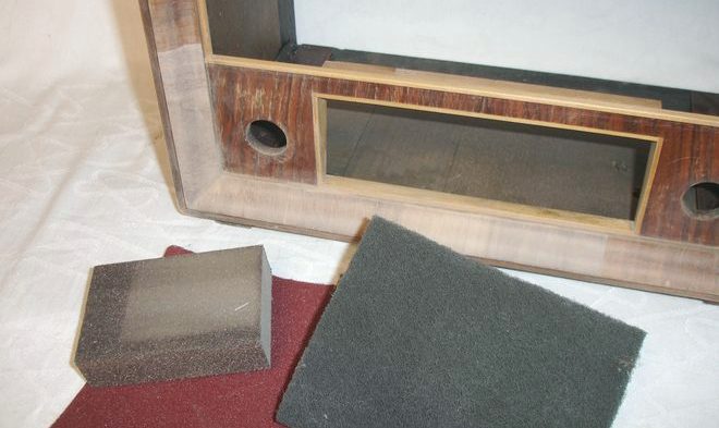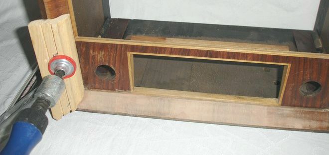 - Dýha sa jemne, v smere letokruhov prebrúsila, najpr zrno 100 a na záver 240. Do hladka sa zahladila mäkkou brúsnou hubkou o zrne 240. Aj celá skrinka sa prebrúsila jemným šmirgľom o zrne 240.