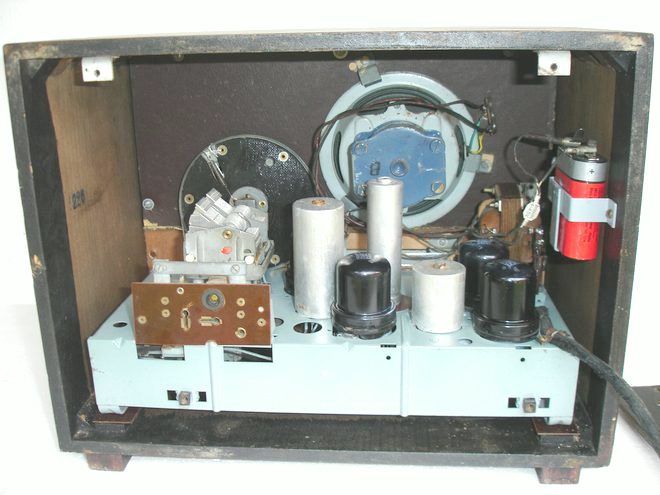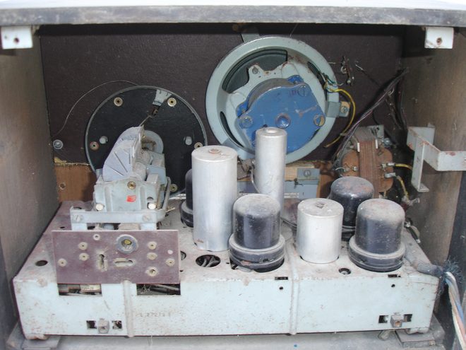 Kompletná zostava, aj s plochou batériou. Vidno aj elektrodynamický reproduktor s permamentným magnetom.