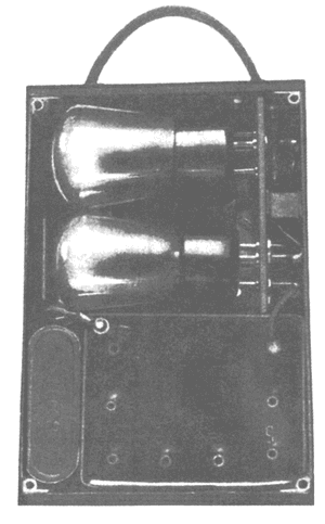 A doboz szerkezetét 2. ábránkon láthatjuk. Fent és lent bakelitlemezek vannak, amelyeket kis sárgarézszegletekkel és csavarokkal az előlaphoz erősítünk. A hátoldalon sárgarézcsíkokból készült merevítők rögzítik a két bakelitlemezt. E két sárgarézszalag felső és alsó végében egy-egy sárgarézhüvelyt forrasztunk, amelyekbe csavarok részére menetet vágunk. A hátlapon 4 megfelelő furat van, amelyeken keresztül 4 csavarral erősítjük a hátlapot helyére.