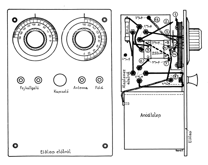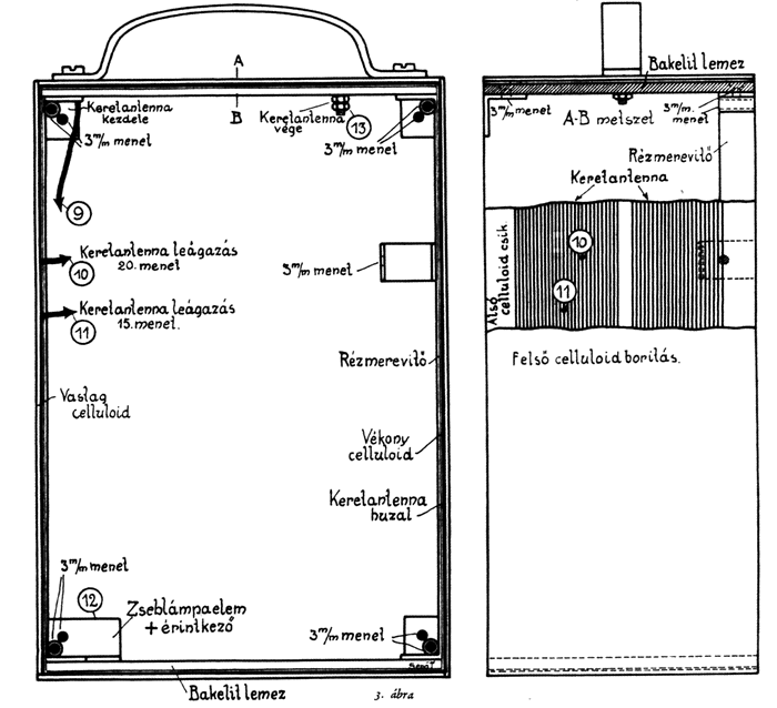 A keretantennát 0,3 vastag, kétszer selyemmel szigetelt huzalból készítjük, összesen 60 menetet csévélünk fel és a 15. és 20. menetnél leágazást készítünk. Az előbbi ábráinkon 11 számmal, az utóbbit 10 számmal jelöltük.