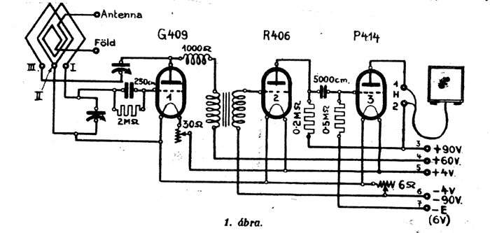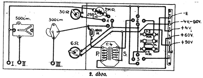 A készülék üzembehelyezése úgy történik, hogy első-sorban a 4. ábrán. I., II., III-mal jelzett szorítócsavarokkal, rövid zsinórokkal összekötjük, azután a készülék alapdeszkára felerősített és csavarokkal ellátott léc 1. csavarját a hangszóró — pólusával, a 2. csavarját a hangszóró + pólusával, a 3. csavarját az anódtelep + 90, a 4. csavarját a + 60, az 5. csavarját az izzítótelep + pólusával, a 6. csavarját az izzítótelep és az anódtelep — pólusával, a 7. csavarját az előfeszültség — pólusával kössük össze. Most a visszacsatoló forgókondenzátor tárcsáját forgassuk meg lassan és annál a helyzetnél álljunk meg, amikor a jelentkező fütty éppen eltűnik. Ezen művelet után a hangoló forgókondenzátor-tárcsának forgatásával az állomást állítsuk be.