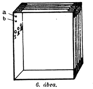 Amikor a ragasztás megszáradt, fúrjunk ki a 6. ábrán I., II., III., valamint a és b-vel jelzett helyeken 3 mm-es lyukakat s azokba helyezzünk be 12 mm hosszú, laposfejű, sárgarézcsavarokat, melyeket majd a keret belső oldalán sárgaréz csavaranyákkal megszorítunk.