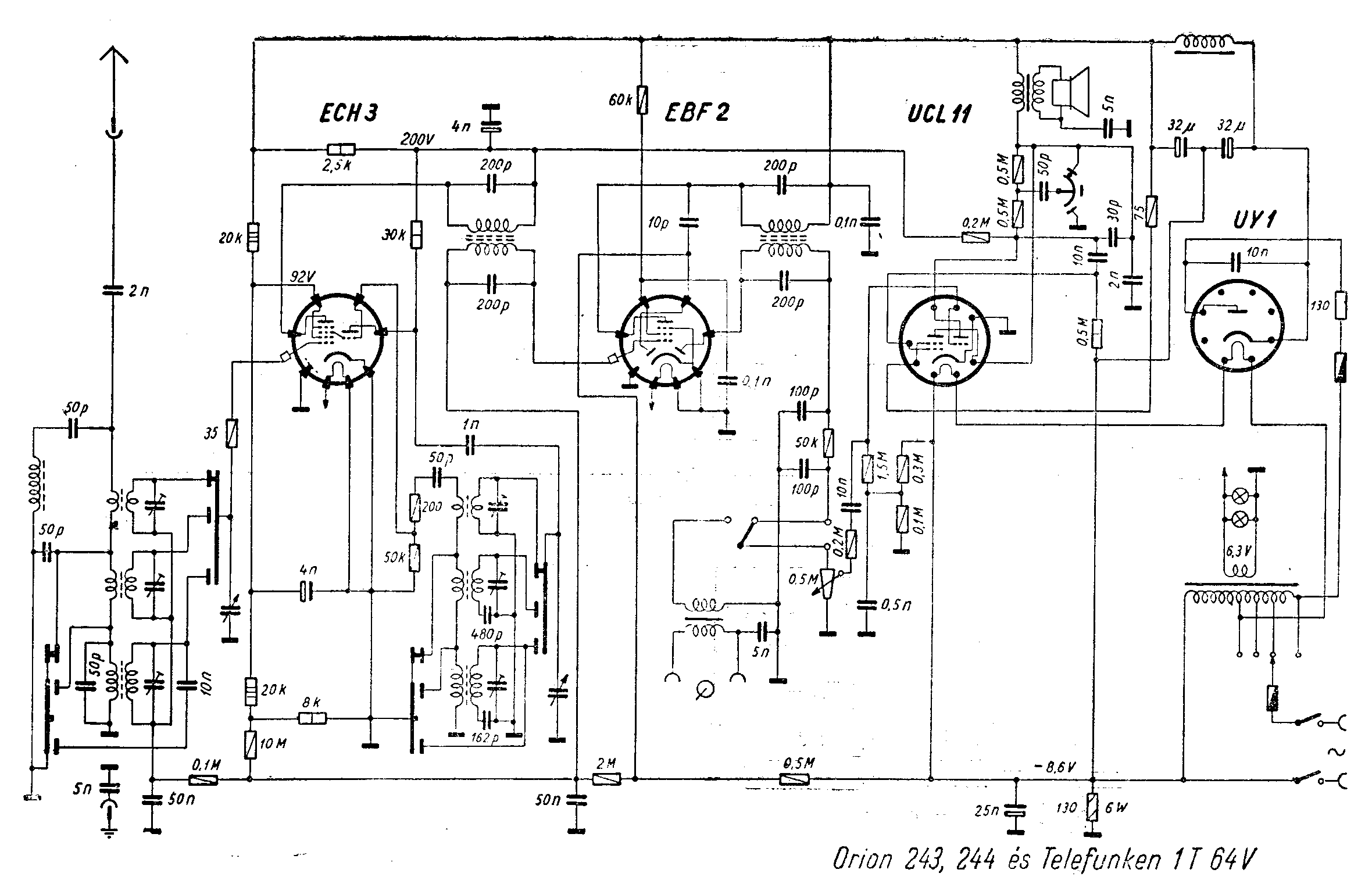 A hangfrekvenciás részt tulajdonképpen az UCL11-es cső képezi, melynek előnyeiről, jelentőségéről a Standard Kisszuper ismertetésénél olvashattunk, igaz ott az ECL11-ről van szó, de mindaz áll az UCL11 -re is. A hangszínt 3 állásban a kapcsoló az UCL 11 két anódkörében kapcsolja. Említést érdemel a tápegység rész, mely autótrafóval van kialakítva. A primerkört és az anódkört biztosíték védi. A csövezés kombinált, a két első cső 6,3 V-os külön fűtőtekercsről kapják a fűtésüket, ide kapcsolódik a két skálaizzó is. Az UCL 1 1 és az UY 1 fűtése sorba van kötve, ami pont 110 V-ot tesz ki, így az autótrafó 1 10 V-os leágazására van kötve.