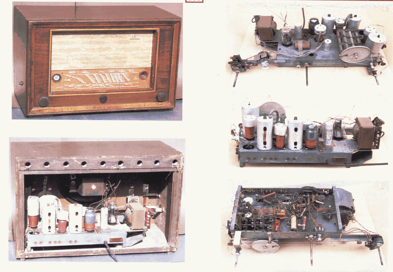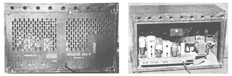 Ez már majdnem luxusszuper. Tartalmaz néhány kényelmi kiegészítést, mint pl. a hangszínszabályzóval együttmozgó mechanikus sávszélesség szabályzást, hangolásjelzőt, fiziológiai hangerőszabályzást és a hullámváltóval egyszerűen kapcsolható helyi adó választás lehetőségét. A 240 mm átmérőjű hangszóró magfelelő mélyhang kisugárzást tesz lehetővé. Aki sokallja a mélyhangokat, az levághatja a beszéd-zene kapcsolóval. Ugyanezeket mondhatjuk el az egy évvel korábbi 442 V típusról is, ez csak külsőleg tér el lényegtelen mértékben az ismertetett készüléktől. Rövidhullámú sávnyújtás nincs beépítve, ezzel majd az 543 V készüléknél találkozunk. Nagyméretű dobozba helyezték, hosszú, külső (pozitív) állomásnév skálával látták el, amelynek megvilágítása oldalról történik, két, kiemelhető foglalatú, így könnyen cserélhető skálaizzóval. |  |