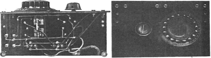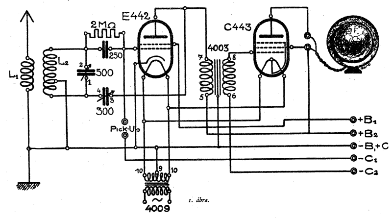 Az 1. ábra mutatja a kapcsolási vázlatot. Mint látható, az első fokozat visszacsatolt audion, a második pedig hangfrekvenciaerősitő. A kapcsolás Hartley-rendszer és a visszatolás szabályozása egy 300 cm-es bakelit-forgókondenzátorral, a behangolás pedig egy 500 cm-es bakelit-forgókondenzátorral történik. Antennatekercsnek és anődtekercsnek kosárfenékfonásu tekercset használtunk.