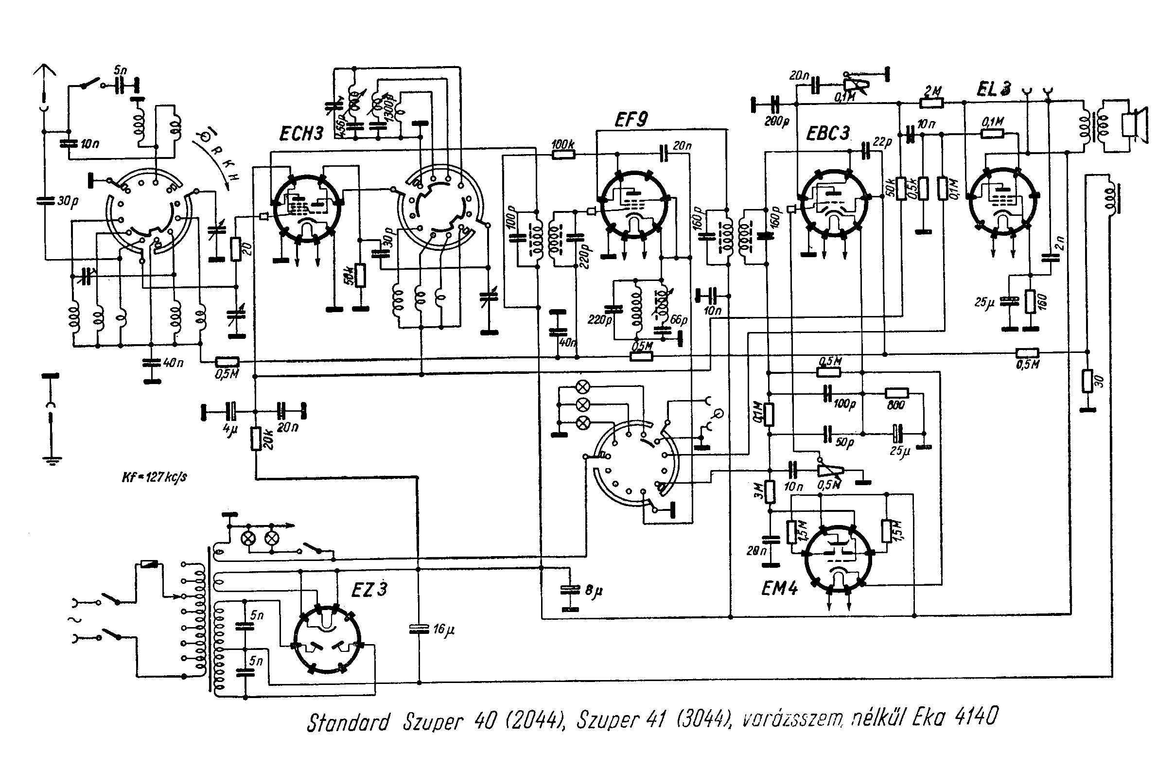 A demodulátor és az AGC dióda a hangfrekvenciás előerősítő csővel közös: EBC3 dióda-trióda. A demodulátor diódának nincs előfeszítése, kimenetén szűrés után a hangerő szabályzót találjuk. Szintén innen kapja a vezérlést az EM4 varázsszem, egy integráló tag után. Igya kétfokozatú hangolásjelző már kis térerőnél is jelez. Az AGC dióda kb. 2,3 V-os előfeszítést kap, amíg ezt a szintet nem éri el a KF jel a diódán, a csövek teljes erősítéssel dolgoznak, és mindegyik fokozat a torzításmentes, lineáris tartományban van. Ettől a szinttől kezdve kezdi el „fogni" az AGC a kimenőszintet, hogy ne vezérlődhessenek túl a fokozatok, és a vett jel jel-zaj viszonya is közel optimálisan alakuljon. A szabályzási tartományt a két első cső átfogása adja, de túl nagy bemenőjelek esetére az antenna söntölhető, vagy lekapcsolható a „Distant-Local" kapcsolóval. Az AGC-ről majd bővebben a Hármasszupernél, mert ott más beállítás kell.