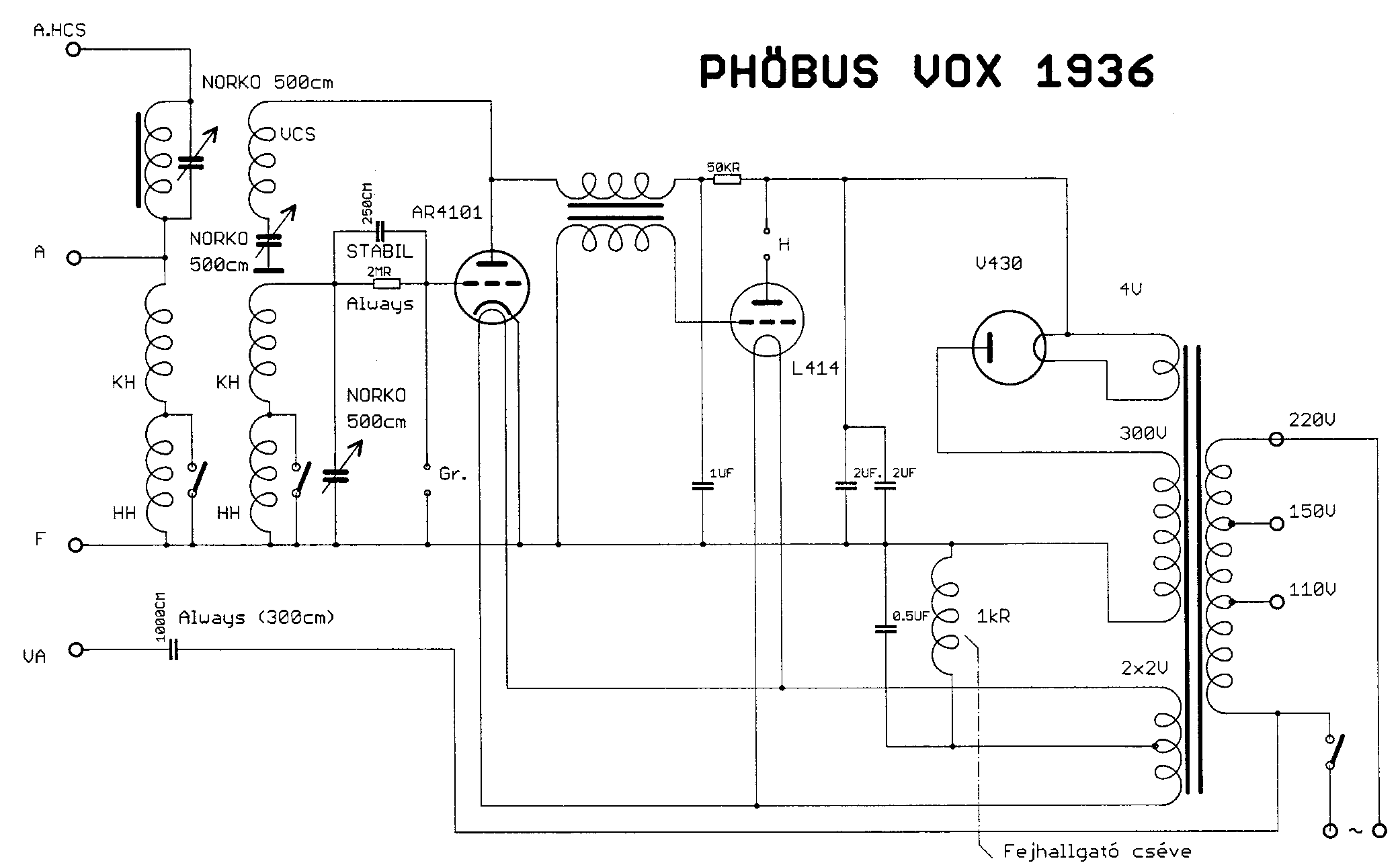 A hullámcsapda tekercse is kereszttekercselésű és vasmagos kivitelű, a BP. l-re van behangolva. A rezgőköri tekercs, a két trafó, a blokktömb olyan alkatrész, melyet más rádióban még nem láttam. A hullámváltó 3 állású 3 áramkörös, egy áramkör a hálózat kapcsolja, kettő a rezgőköröket. A huzalozás, egyszerű 0,5 mm-es kötőhuzal barna varniscsöbe bujtatva.A rácskomplexum varniscsöbe bujtatott 2 Mohm Always, és STABIL feliratos 250 cm kondenzátor. Az anódköri feszültségejtő 50 Kohm is Always. Az előfeszültségek ejtő 1 Kohm egy fejhallgató cséve,. Ez a két utóbbi a blokktömb kivezetéseire van forrasztva. A bemutatott példány mivel teljesen eredeti jó állapotban volt, hamar kikottáztam a kapcsolási rajzot is, mert természetesen a VOX már az a kategória, amelyről'sehol sem jelent meg kapcsolási rajz a korabeli időkből, hisz szinte még a létezéséről sem tudtak. A kapcsolási rajz legegyszerűbb, 1936-ban már korszerűtlennek számított, a legelső 2+1-esek készültek így 1930. tájékán. Egyutas egyenirányítás, két trióda, trafós csatlakozás, egy hullámcsapda elég volt, hisz csak körzetvevőnek készült. Ez a készülék már vagy 15-20 éve gyűjteményemben van, de információ hiányában csak most esett át a felújításon.